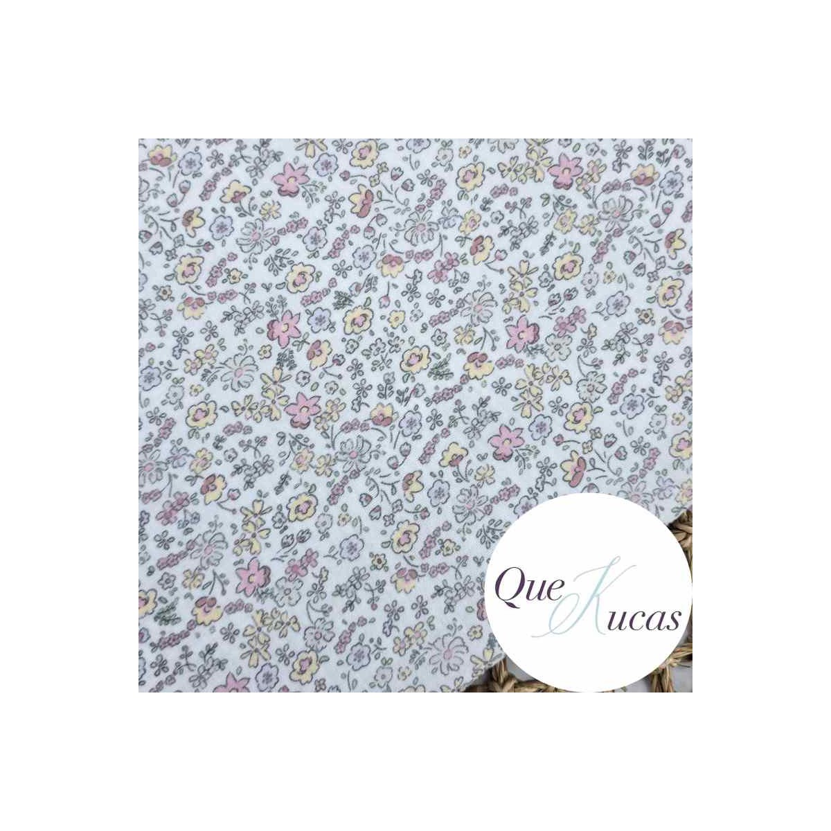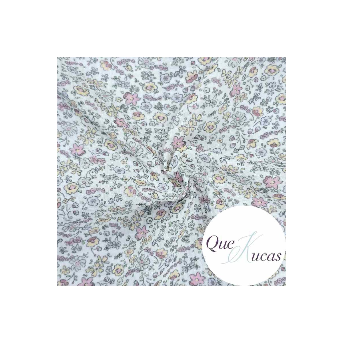 Doble gasa estampada de flores en tonos rosa, amarillo pastel, azul pálido y verde sobre fondo blanco
