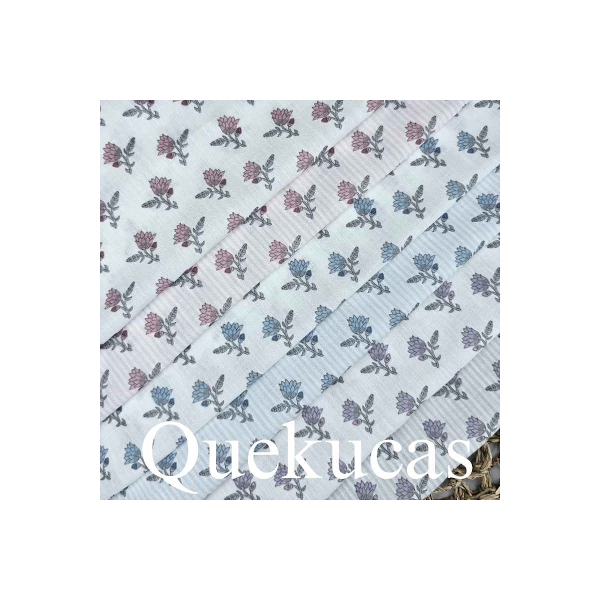 Falso lino con estampado flores en color rosa empolvado sobre fondo de rayas rosa.