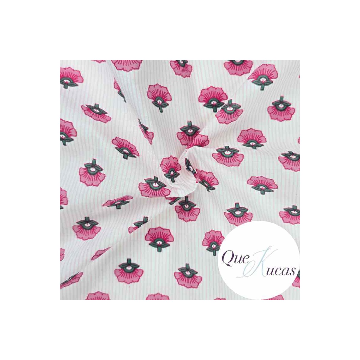 Tejido de algodón natural, cultivado y tejido en la India (país reconocido como el mayor productor de algodón mundial) Con un estampado característico, por sus diseños y colores, esos colores vibrantes que sólo la India puede darnos.  Estampados a mano; uno a uno, mediante la milenaria técnica Hand Block (estampación con bloques de madera) con tintes vegetales y minerales extraídos de plantas o semillas como el azafrán o la cúrcuma. Para su estampación se utilizan desde 3 a 30 bloques de madera tallados de forma artesanal; utilizando uno para cada color. Es un tejido ligero y suave cómo una batista.