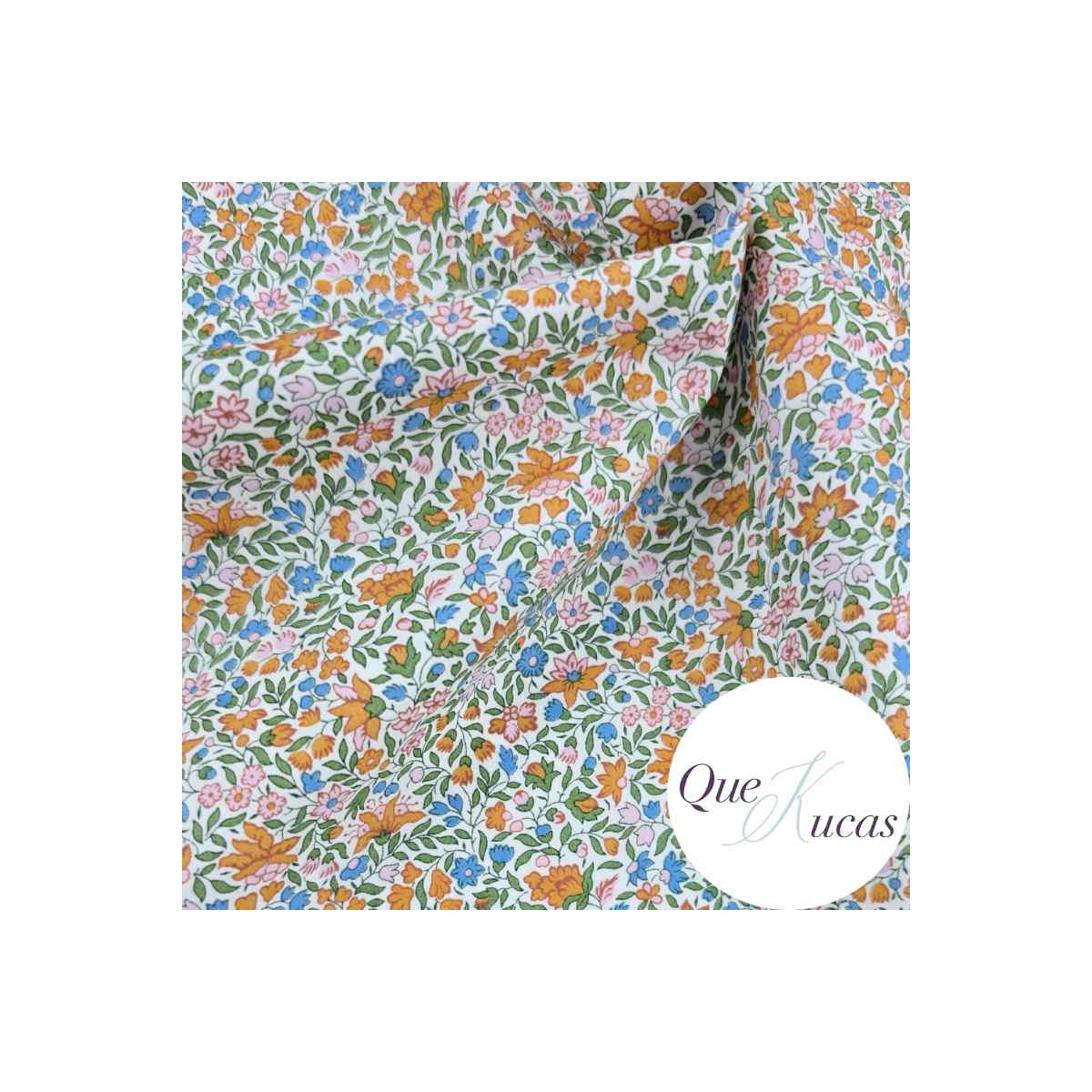 Tejido LIBERTY estampado de flores en tonos teja, rosa, azul y verde sobre fondo blanco