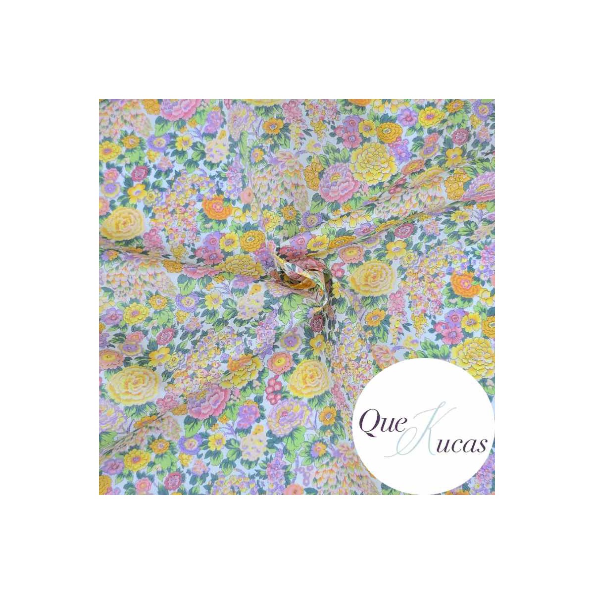 Tejido LIBERTY estampado de flores en tonos lavanda, rosa, amarillo y verde sobre fondo blanco