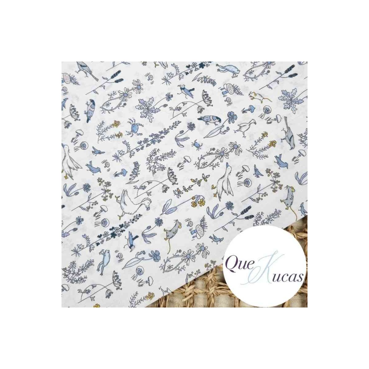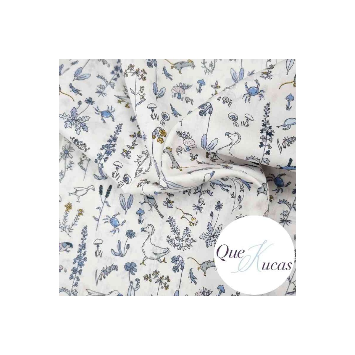 Tejido LIBERTY estampado de animales y ramitas en tonos azules y ocre.