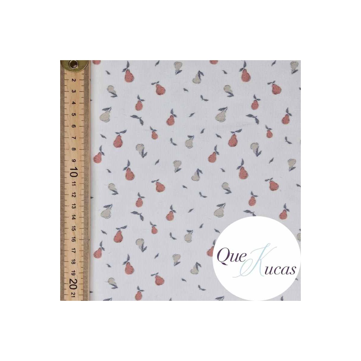Micropana de algodón con estampado de peras en tonos marsala y piedra sobre fondo crudo