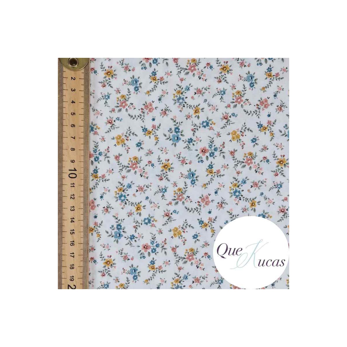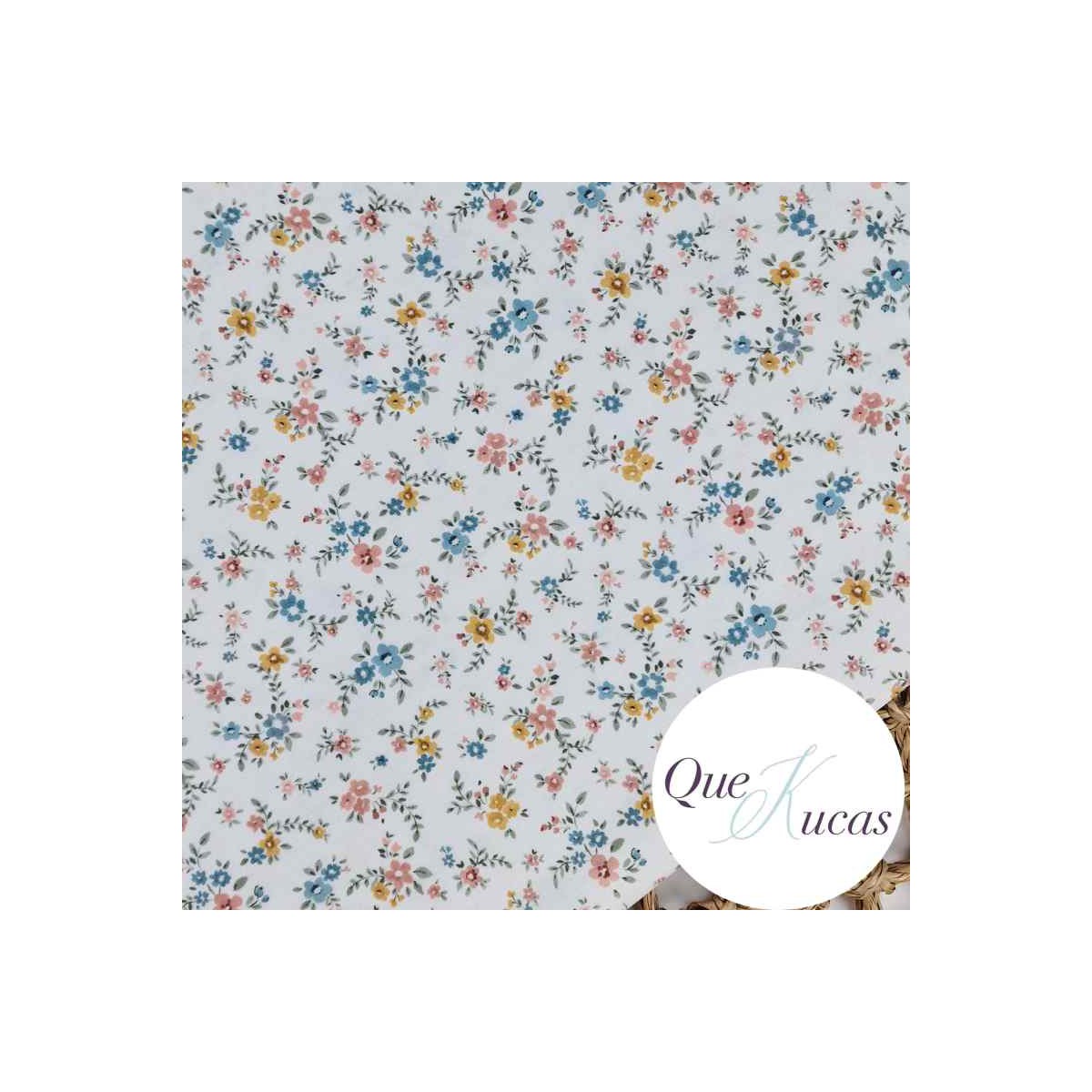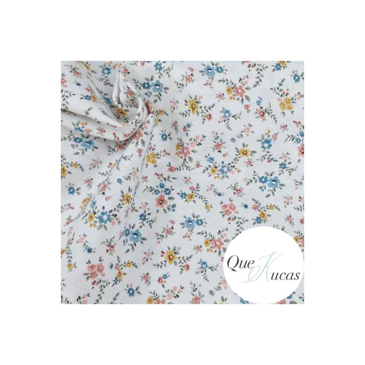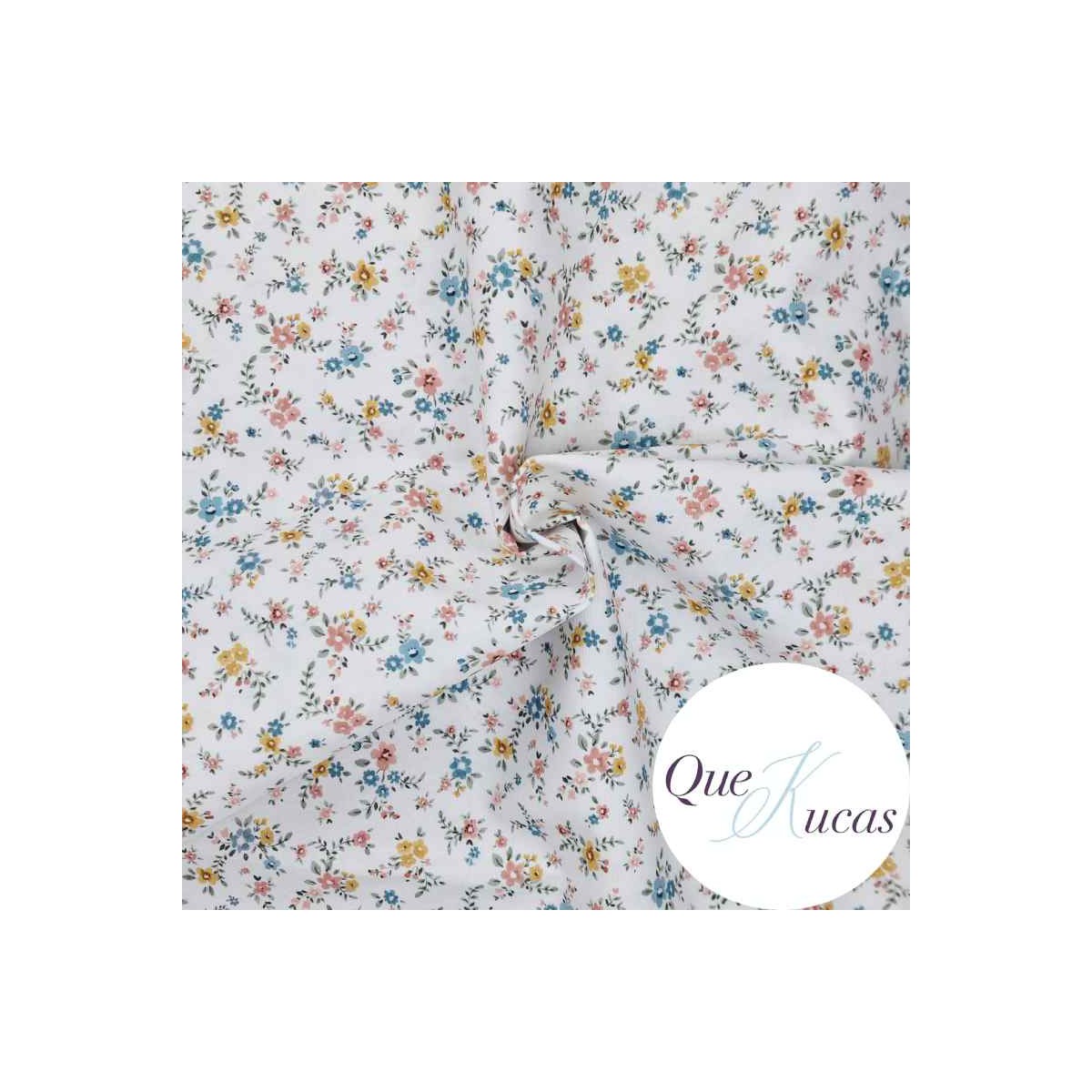 Popelín estampado de flores en tonos rosa, azul, ocre y verde sobre fondo blanco