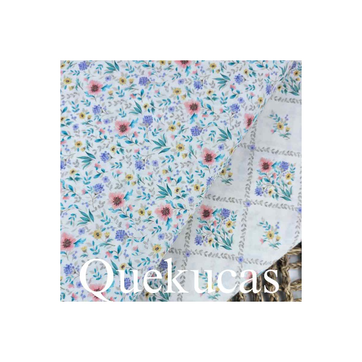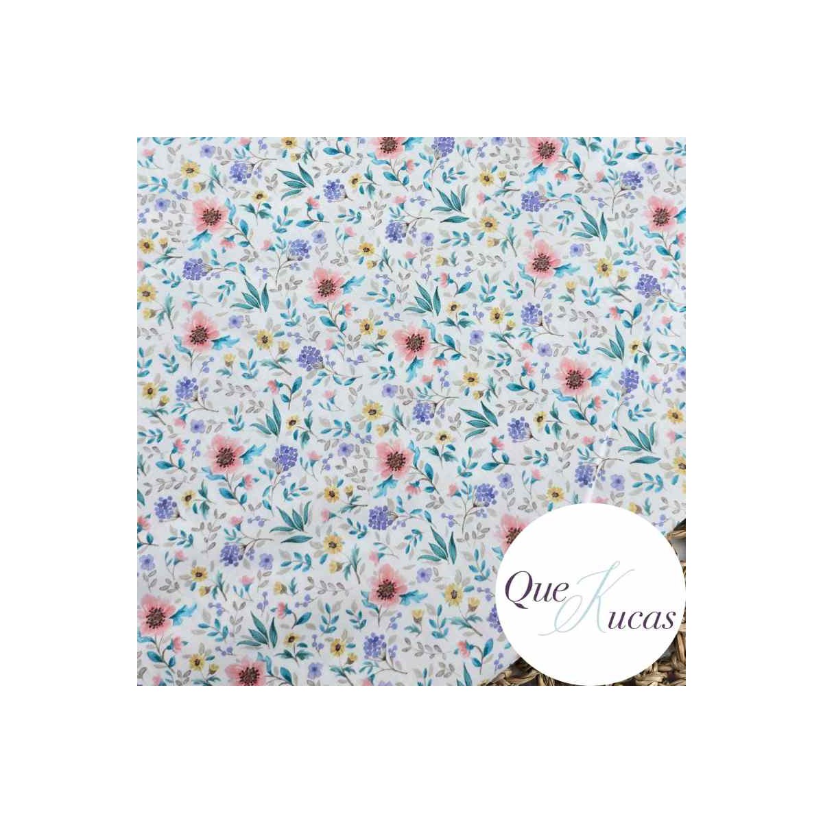 Popelín estampado de flores en tonos rosa, verde agua, azul lavanda, amarillo y piedra sobre fondo blanco natural