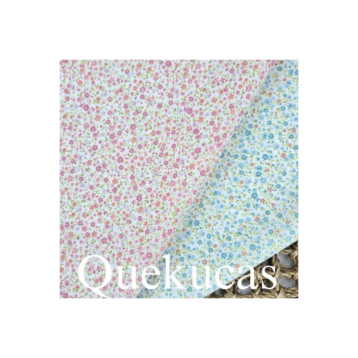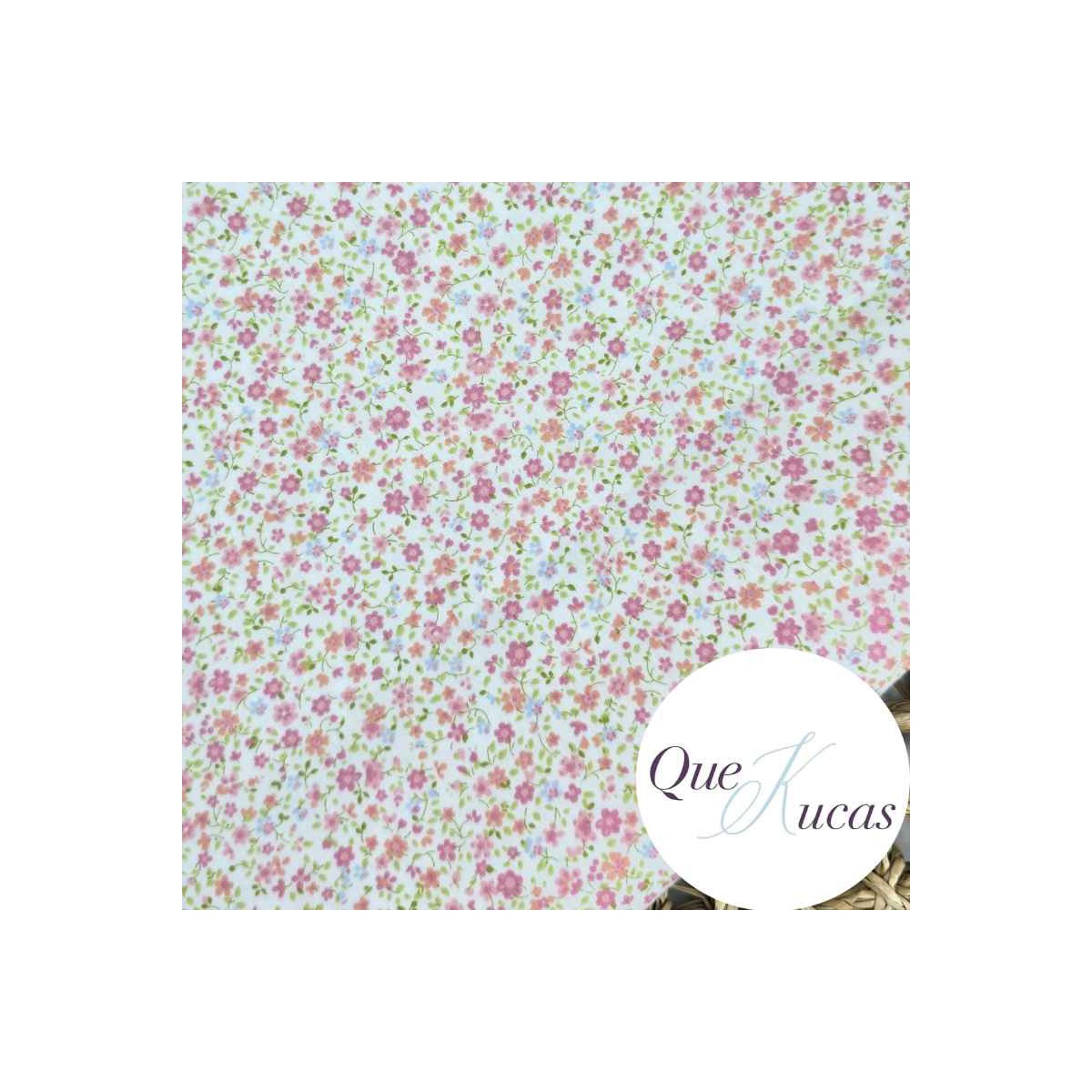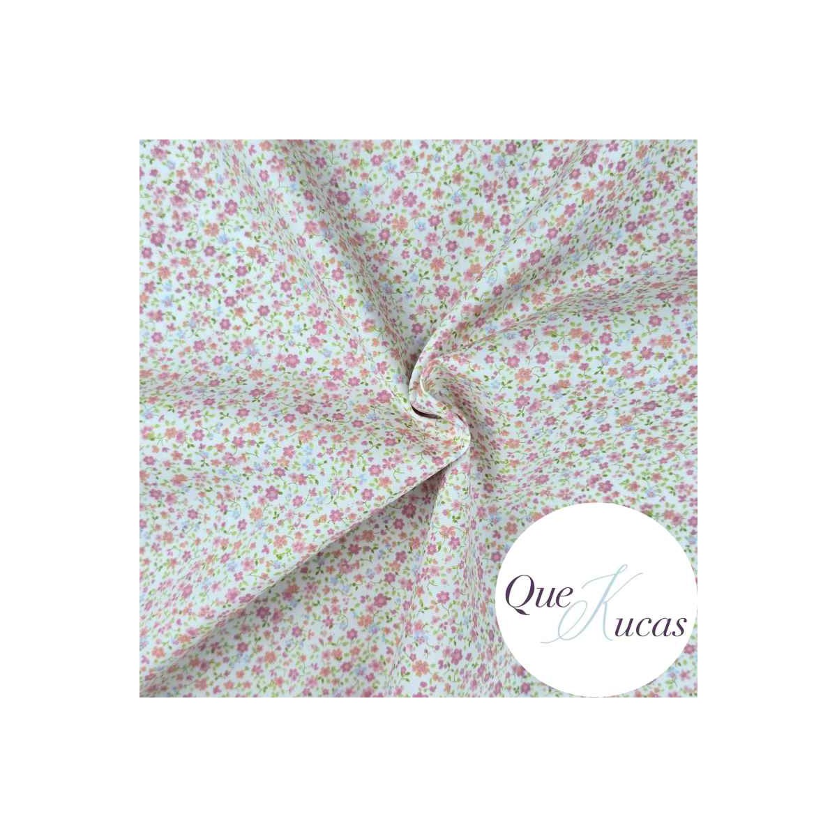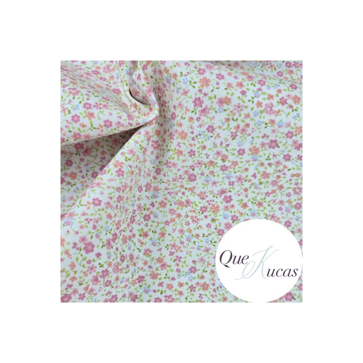 Popelín estampado de pequeñas flores en tonos rosa, salmón y azul sobre fondo blanco