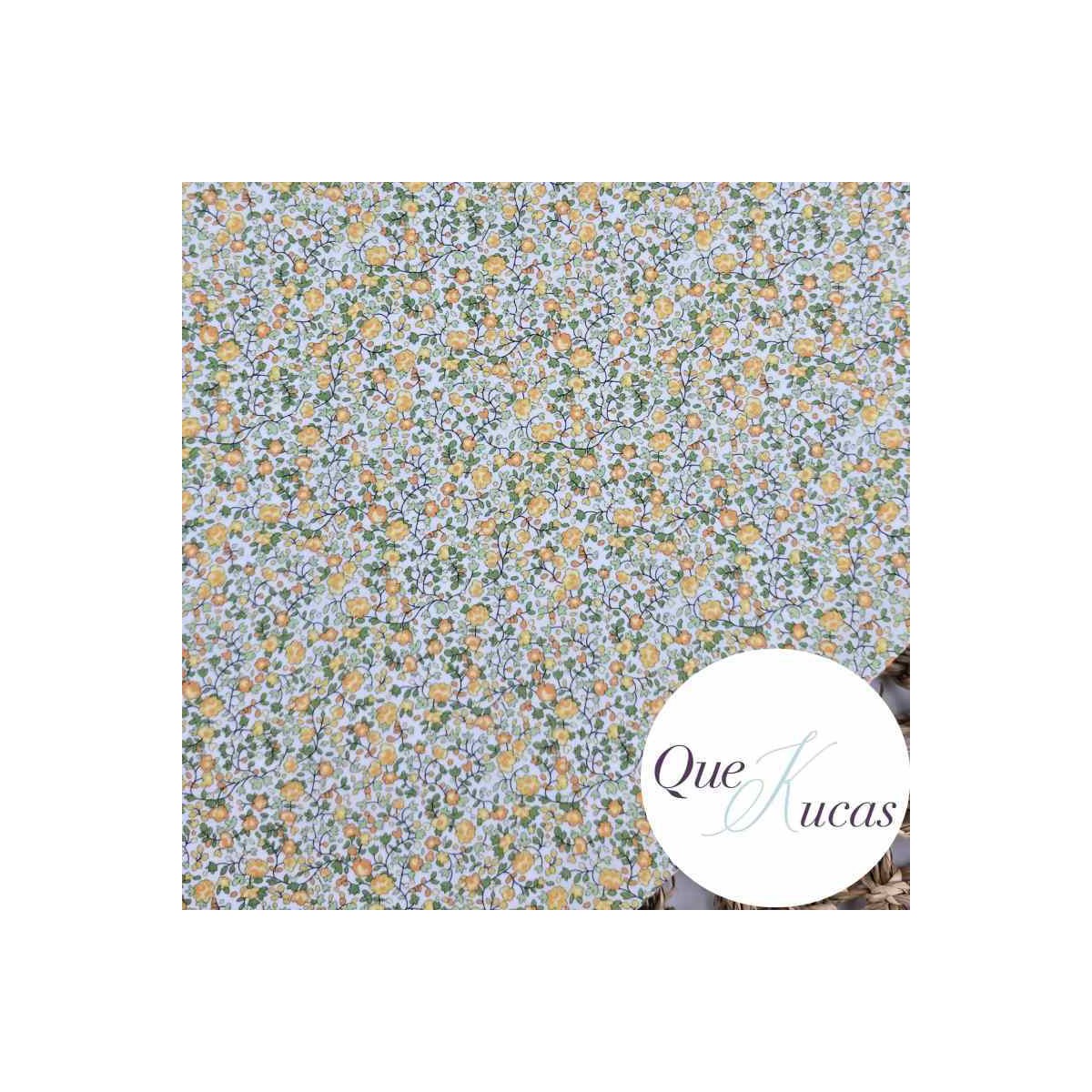 Popelín estampado de pequeñas flores en amarillo y verde sobre fondo blanco