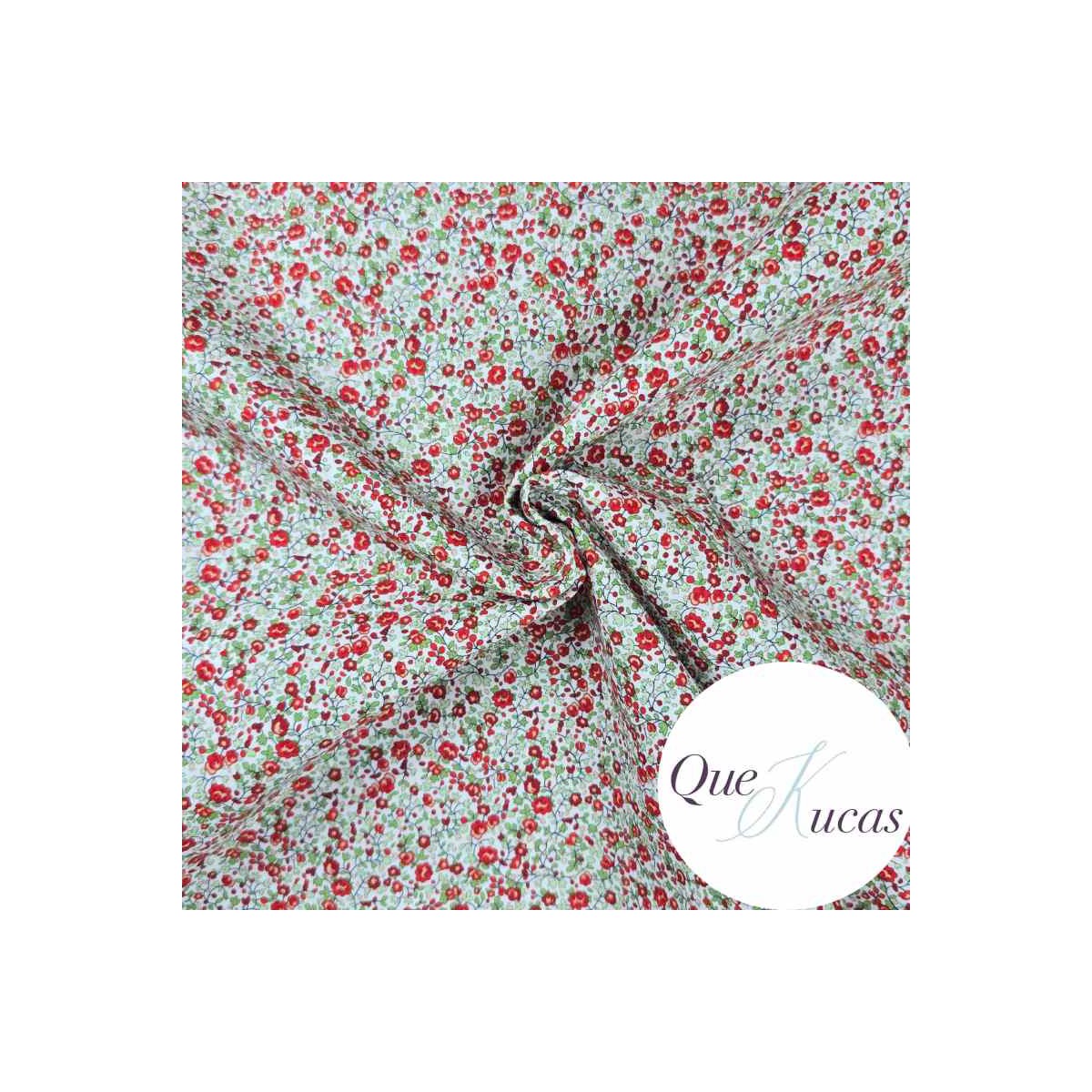 Popelín estampado de pequeñas flores en rojo y verde sobre fondo blanco