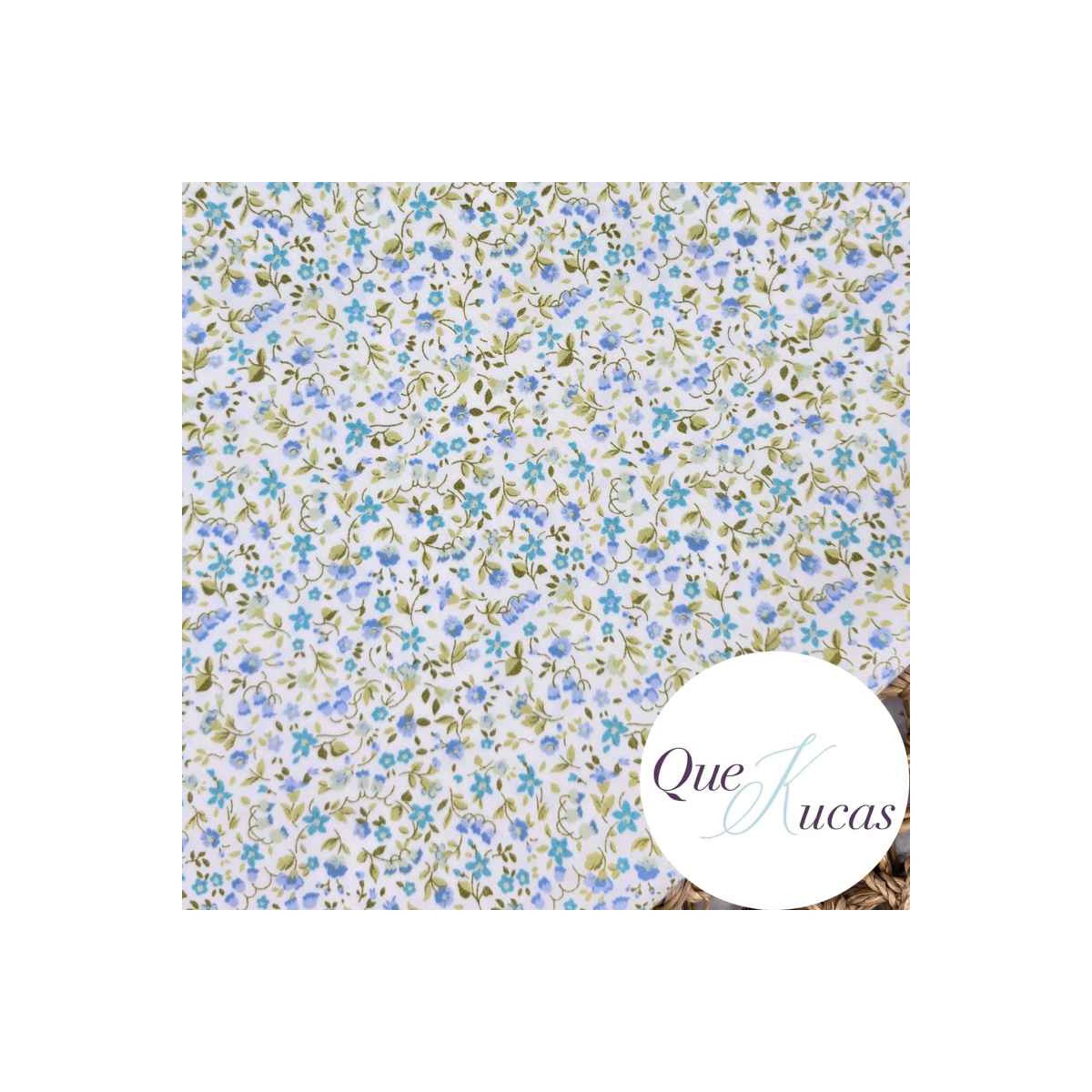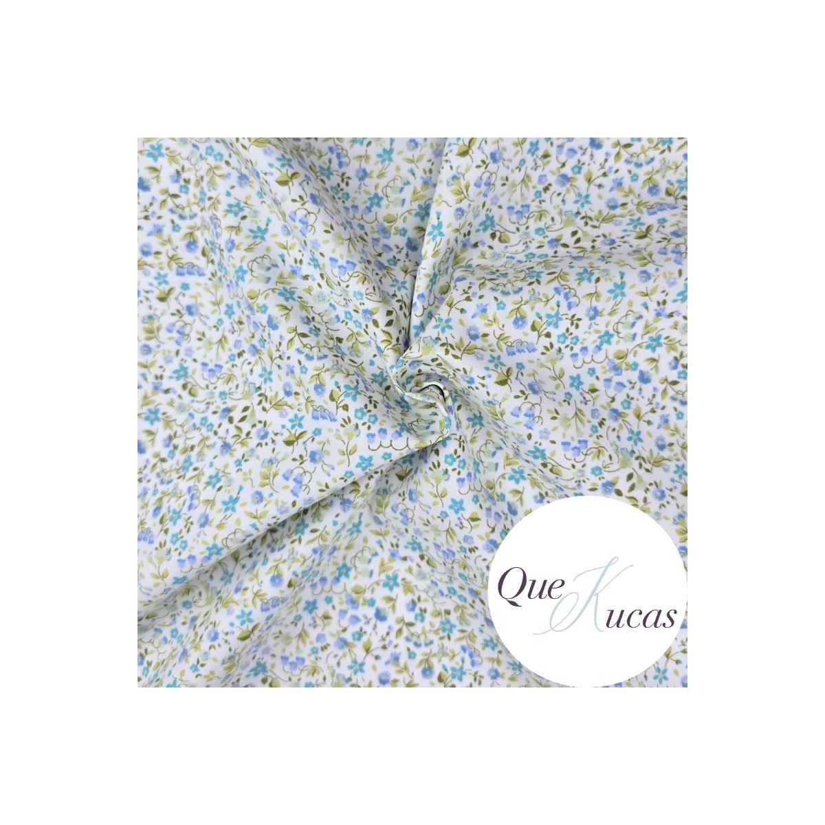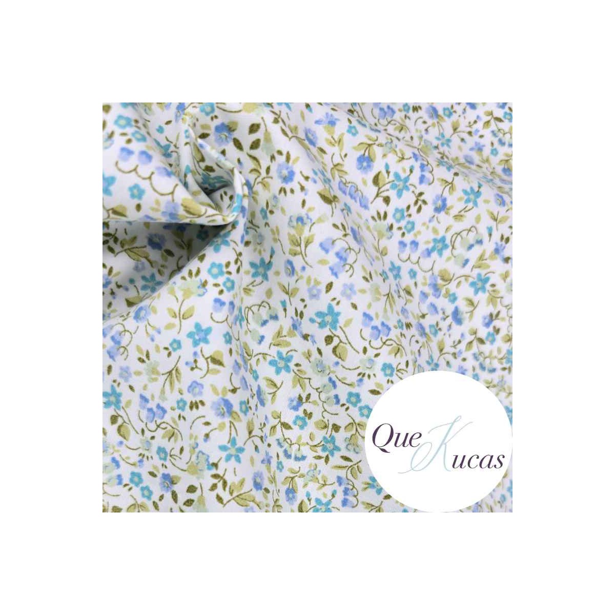 Popelín estampado de flores en tonos verde agua, azul y verde sobre fondo blanco