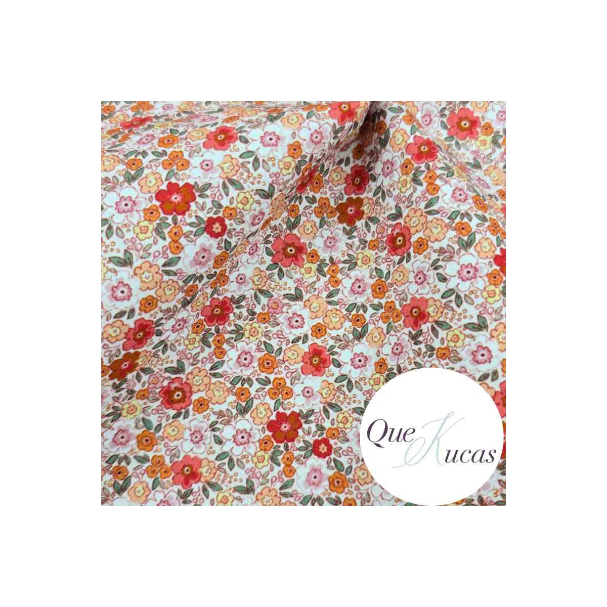 Popelín estampado de pequeñas flores en tonos rojo coral, naranja y verde