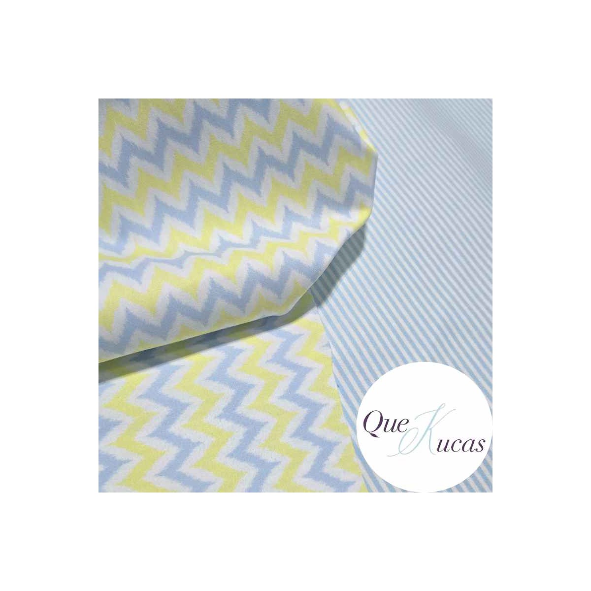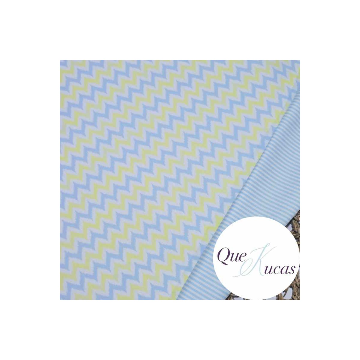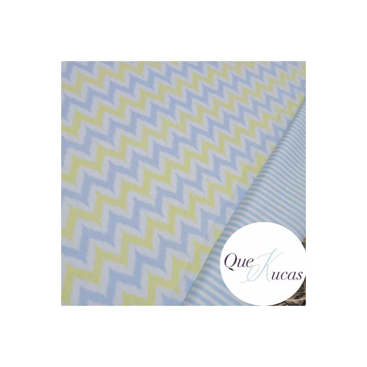 Tejido de microfibra de toalla REVERSIBLE con estampado zig zag en azul y amarillo por una cara y por la otra rayas finas en azul y blanco