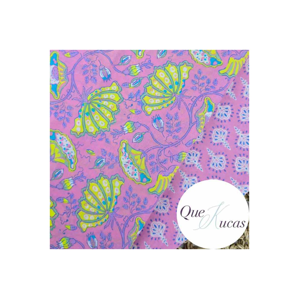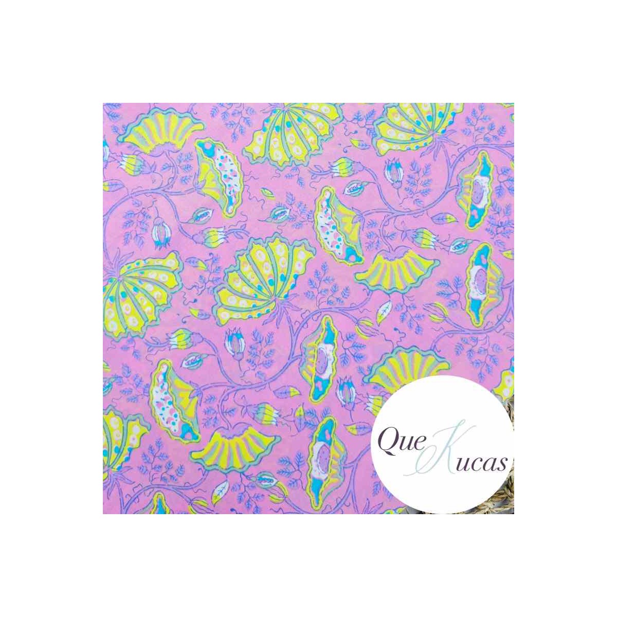 Batista estampada de flores tipo hand block en tonos amarillom turquesa y rosa